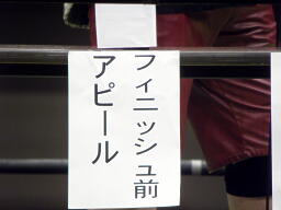 続いてフィニッシュ前のアピール(左写真)は「首をかっ切るポーズ」。