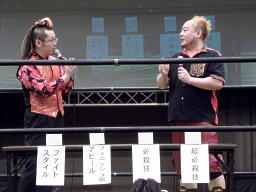 新藤「プロレスラーを構成する5W1H的な要素で、ファイトスタイル、フィニッシュ前のアピール、必殺技、超必殺技をそれぞれ選んでもらいます。」(右写真)