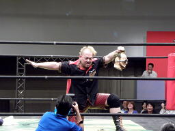 諸橋ヘッドロック、猪熊ロープに振る、諸橋ショルダーブロック(右写真)。
