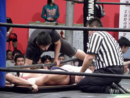 普通にロックアップからスタート(左写真)。1分1本勝負ということで始まってすぐ「残り時間1分」のコール。