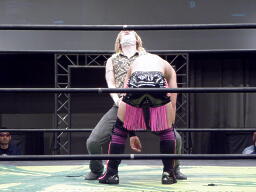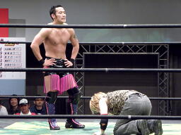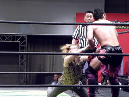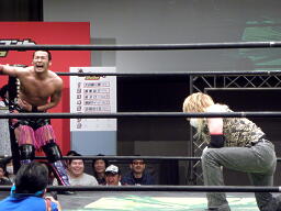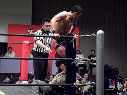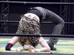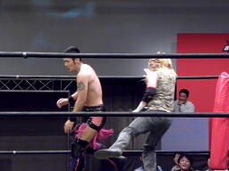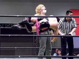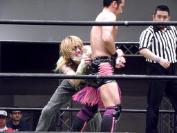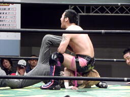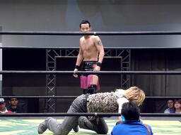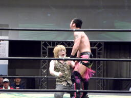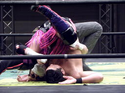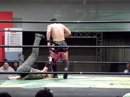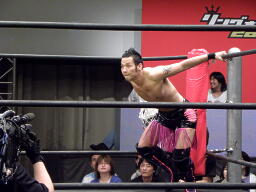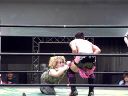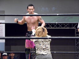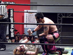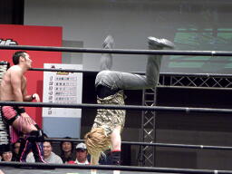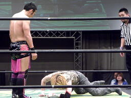 HIROKI突っ込んで串刺しラリアット、ニラ前進して倒れる(右写真)。HIROKIカバー、カウント2。