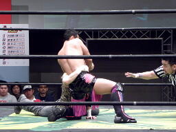 腰砕けになったニラをHIROKIカバー、カウント2。ニラ立ち上がれない(右写真)。
