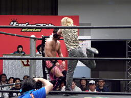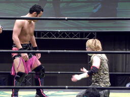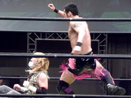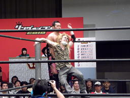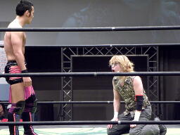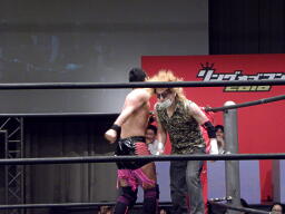 ニラ対角線コーナーに振ってDJタイム狙うがしゃべってる間にHIROKIに逆襲される(左写真)。