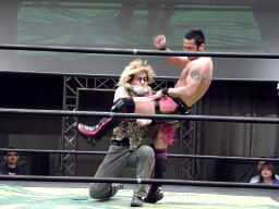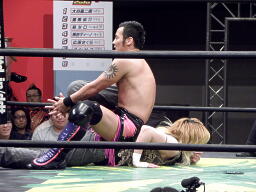 HIROKIフライングメイヤーからグラウンドヘッドロック(左写真)。