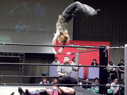 コーナーに上るとムーンサルトプレス(右写真)、飛びすぎてほとんど当たらず。