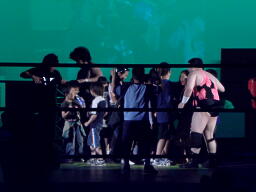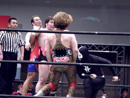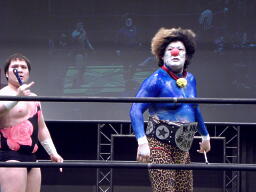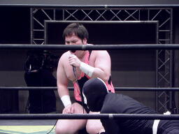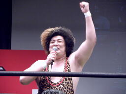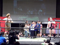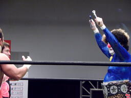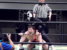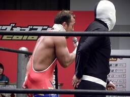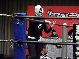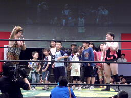 そして下島戦闘員(右写真)。子供たちは審査員席前に避難。子供の扱いに慣れている高木とGENTAROが試合中は世話をする形に。