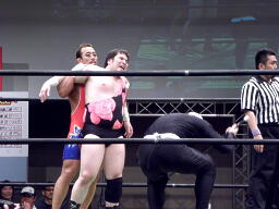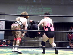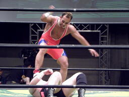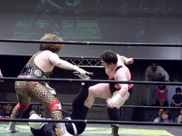 戦闘員をロープに振ってダブルのショルダーブロック(右写真)。