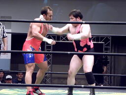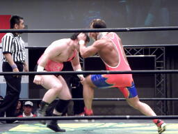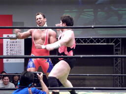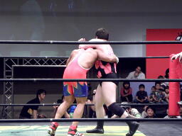 諸橋入ってアントンと対峙。ロックアップ、アントンヘッドロック(右写真)。