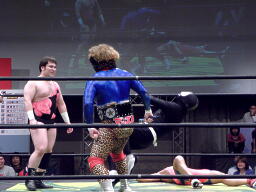 2人で急所にストンピング(左写真)。悪いなあ。戦闘員は場外エスケープ。