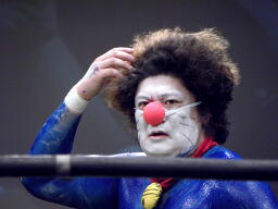 さらにロープワーク、アントンは諸橋のヒップトスを切り返して逆に投げドロップキック、諸橋場外転落。アントンはトペを狙って助走をつけるがまたこける(右写真)。