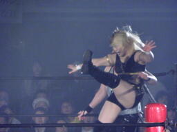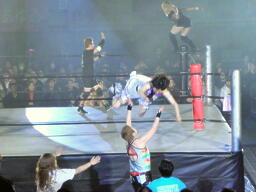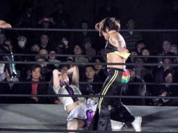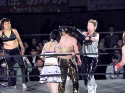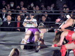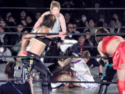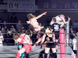 下田がイオをトップロープに引っ掛けて木村と江本がサンドイッチミサイルキック(右写真)、中川も顔面にドロップキック。美央延髄蹴り、真琴にタッチ。5分経過。