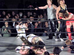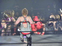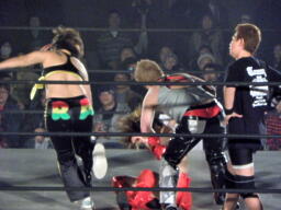 イオミサイルキック(右写真)、中川も木村にタッチ。イオロープに飛んでクロスボディ、木村キャッチしてスラム。