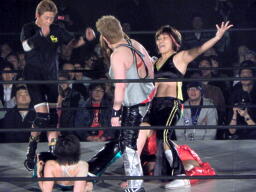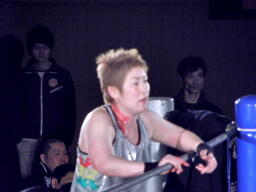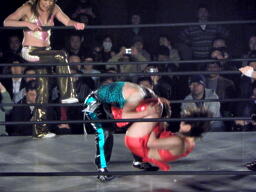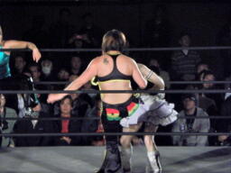 下田が真琴にジャーマン、コーナーに乗せてデスレイクドライブ狙うが美央が逆にジャーマンで下田を投げる(左写真)。