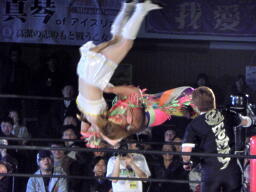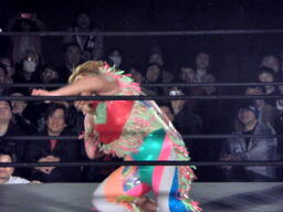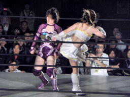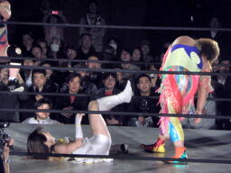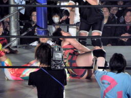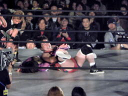 風香ロープに振る、京子切り返すが風香はコルバタ(右写真)。さらにカサドーラ、カウント2。