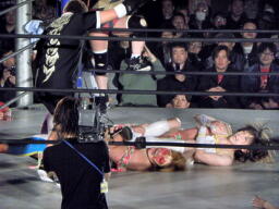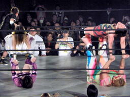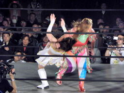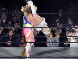 京子ラリアット、さくらコーナーからダイビングボディプレス(右写真)、カウント2。