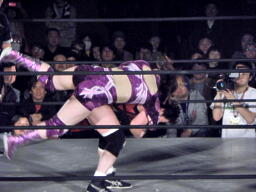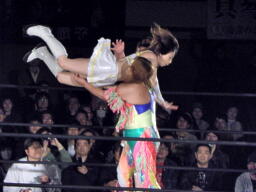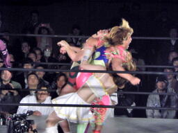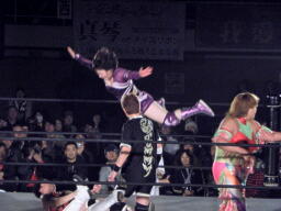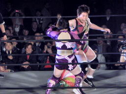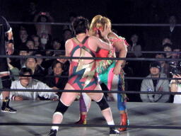 神取パワーボム狙う、京子が風香を腰にくっつけたままカット(左写真)。