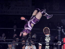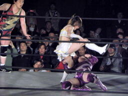 京子が神取に吊り天井狙うが風香がカットに。これをさくらが捕らえ京子とさくらダブルの吊り天井(左写真)。