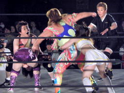 神取と風香がダブルでロープに振るが京子は2人にラリアット(右写真)。