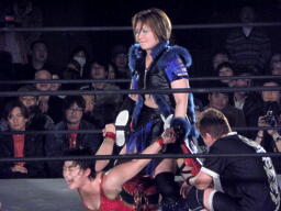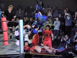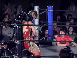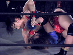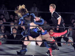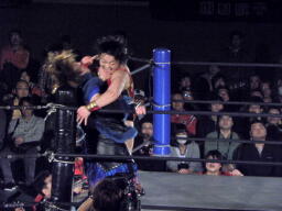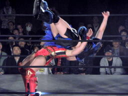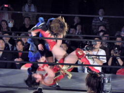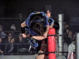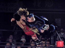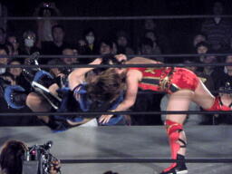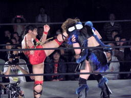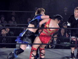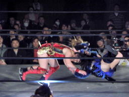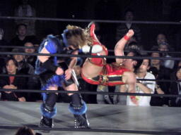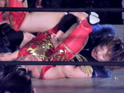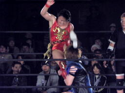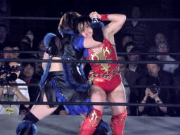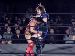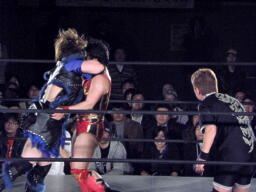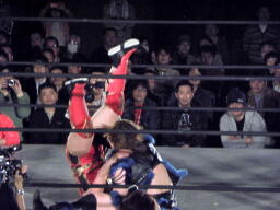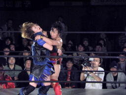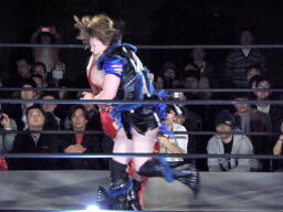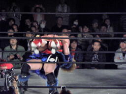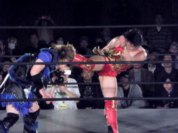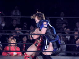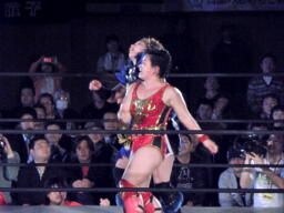 里村バックドロップ狙う、田村ブロックしてラ・マヒストラル(右写真)、カウント2。田村パトリオットバスター、カウント2。