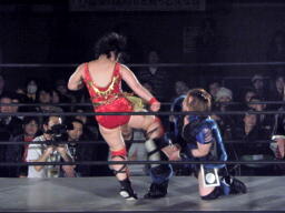 両者握手(右写真)。ロックアップ、ブレーク。手四つでリスタート、田村が腕をひねる、里村切り返す。腕の取り合い、里村がホイップに行くが田村ブロック。里村トラースキック、田村かわしてダイアモンドカッター、里村は側転してブロック。