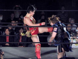 エルボーの打ち合い、里村ミドルキック連打(左写真)、延髄蹴りは田村スカす。10分経過。