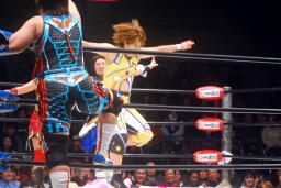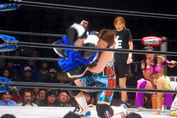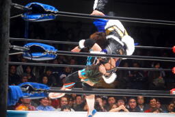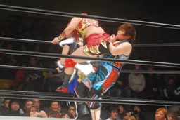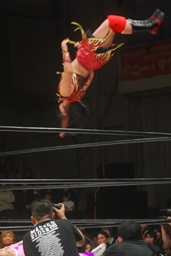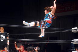 勇気タニーをブレーンバスターで投げコーナーに上るとダイビングエルボードロップ(右写真)、カウント2。