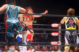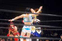 宮崎コーナーに上ってムーンサルトプレス3連発決めるが(右写真)2人にカットされる。