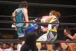 宮崎が飯田を肩に担いでチーズスター狙うが飯田は回転エビ固めに(右写真)、カウント2。
