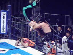 デヴィットがゲレーロをコーナーに上げて雪崩式ブレーンバスター狙う、ゲレーロブロックして雪崩式フェースバスターに切り返す(右写真)。