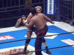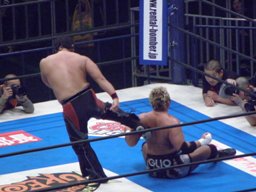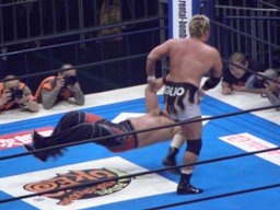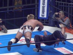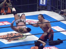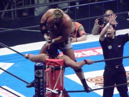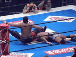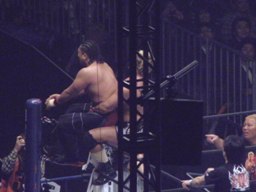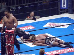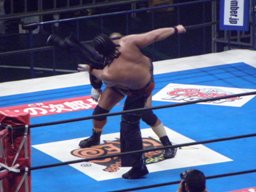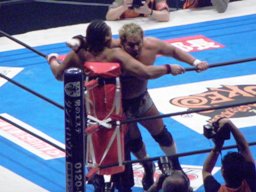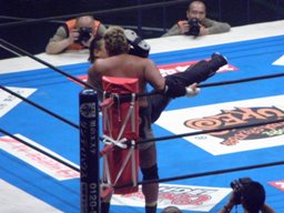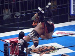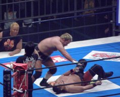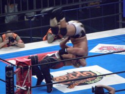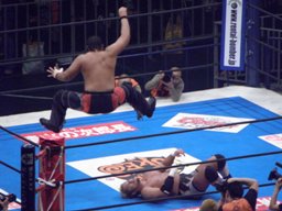 コーナーに上ってダイビングギロチン(右写真)、カウント2。