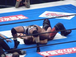 真壁コーナー上で向きを変えるとダイビングニードロップ(左写真)、ヨネあっさり3カウントを聞く。