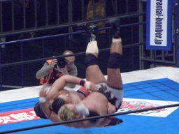真壁ノーザンライトスープレックスホールド(左写真)、カウント2。