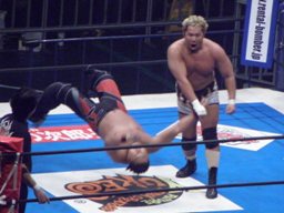 真壁ジャーマン、ラリアット(左写真)。