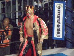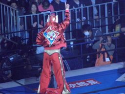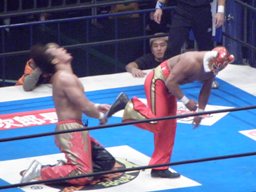 丸藤トラースキック、張り手、バックスピンしてトラースキック。コーナーにタイガーを上げると不知火・改(左写真)、カウント2。