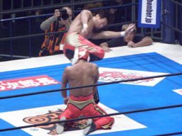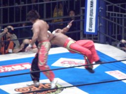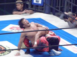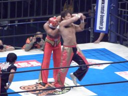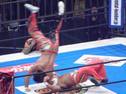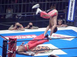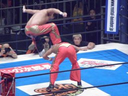 タイガー投げっ放しのミレニアムスープレックス(右写真)、カウント2。タイガーはデストロイスープレックス狙う、丸藤ブロックしてハイキック。
