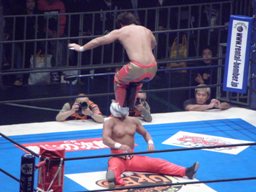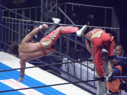 ロープワーク、タイガーはリープフロッグで丸藤をかわすとレッグホイップ(右写真)。