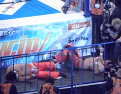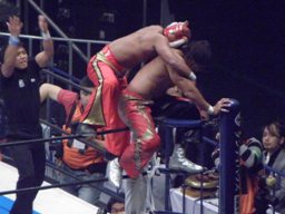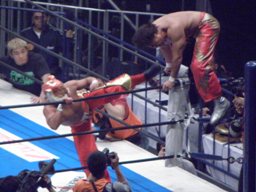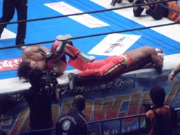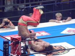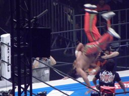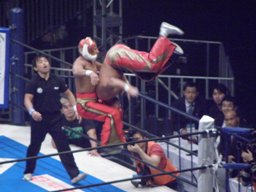 マットに転落したタイガーに逆コーナーからミサイルキック(左写真)、タイガー場外転落。