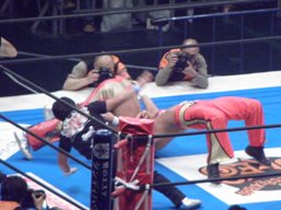丸藤トップロープ越えのミサイルキック狙うがタイガーエプロンに上がってドロップキック(右写真)。