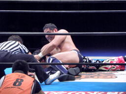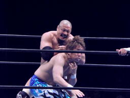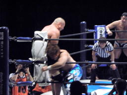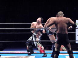 飯塚がタッチロープで井上の首を絞める(右写真)。カバー、レフェリータッチロープを見逃してカウント取る、カウント2。飯塚再度カバー、またも2。TAJIRIにタッチ。