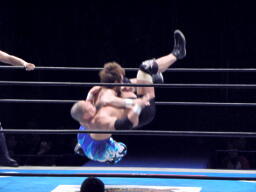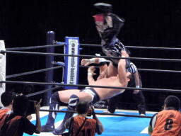井上ロープに飛ぶ、飯塚キャッチしてマンハッタンドロップ(左写真)、場外に出す。TAJIRIがキック、リングに戻す。