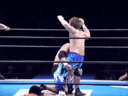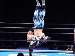 TAJIRIブレーンバスター(左写真)からその場跳びムーンサルト、カウント2。首投げからサッカーボールキック、カウント2。飯塚にタッチ。