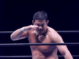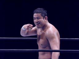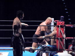 飯塚コーナーに詰めてパンチ連打(右写真)、踏みつけ。場外に出してボディスラム、リングに戻るとTAJIRIにタッチ。