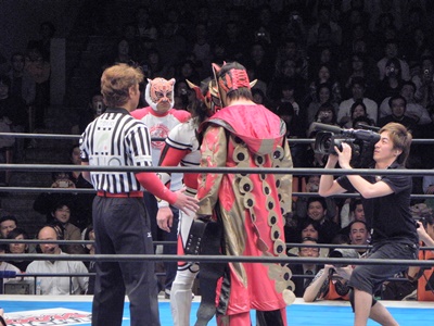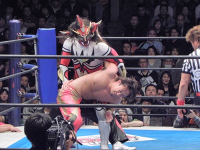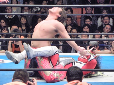丸藤ヘッドロック、ライガー切り返してメキシカンストレッチ(左写真)。