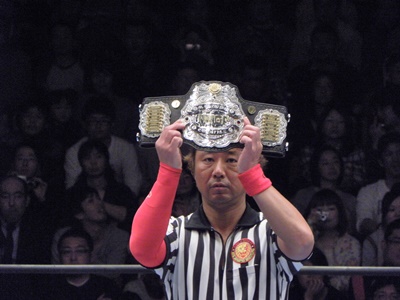 IWGPジュニアのベルト(左写真)。新日本はすでに2人の刺客が返り討ちに。ライガーのセコンドには田口、タイガー、吉橋。丸藤のセコンドは青木。