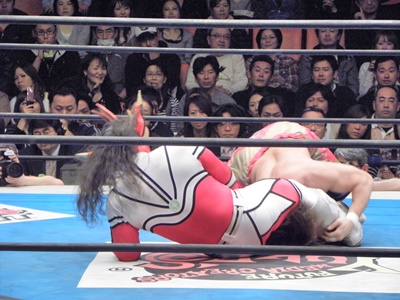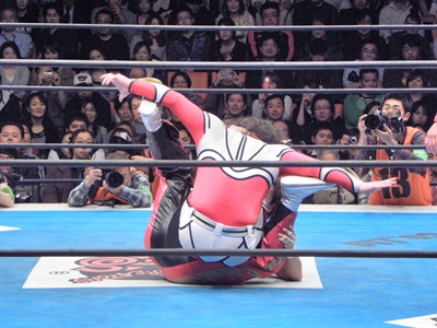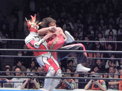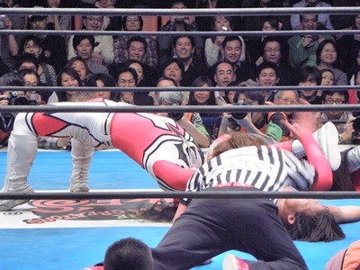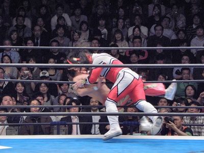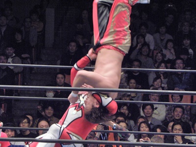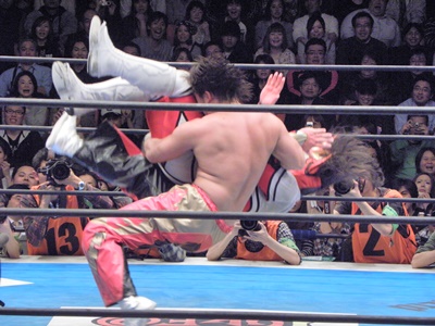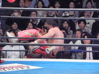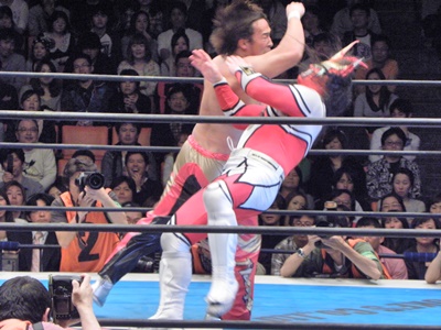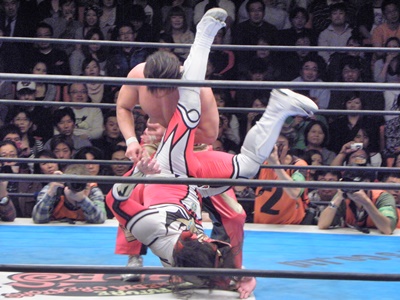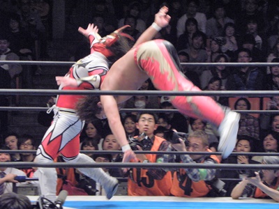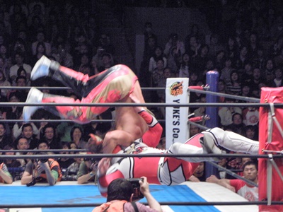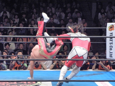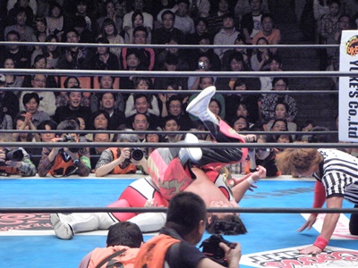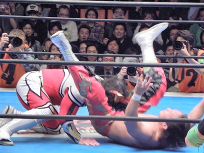 丸藤ロープに飛ぶ、ライガーはカウンターのフライングボディシザーズドロップ(右写真)、カウント2。