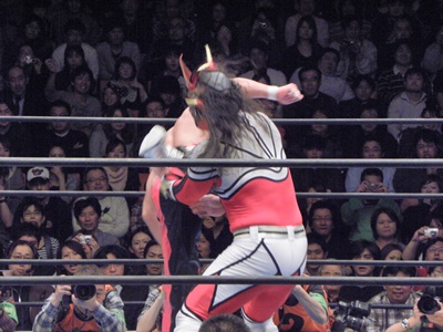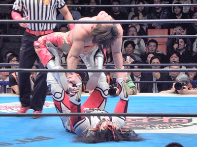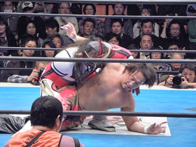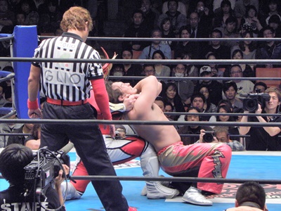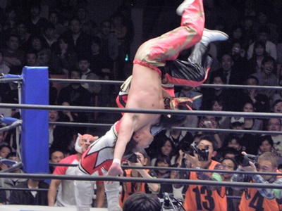 丸藤鉄柱を挟んでスリーパー、エプロンへの垂直落下式ブレーンバスター(左写真)。リングに戻してカバー、ライガーは足をロープに。