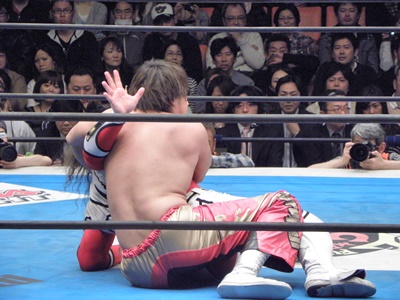 ライガーチンロック、ヒザは丸藤の背中に(右写真)、丸藤脱出、ライガーは丸藤の背中にエルボー。