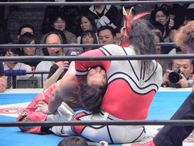 ライガーブレーンバスターの体勢、丸藤着地してバック取る、ライガーサムソンクラッチ風のエビ固めに(右写真)、カウント2。