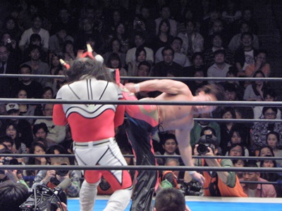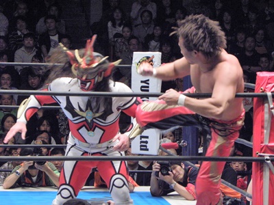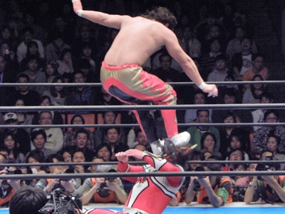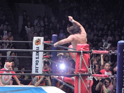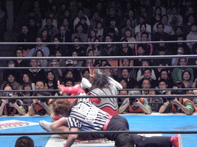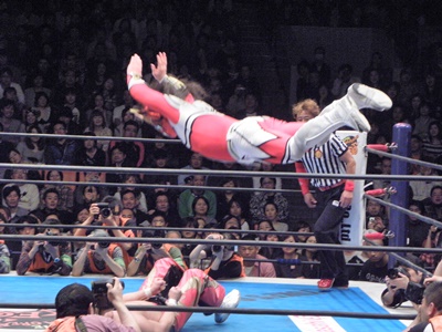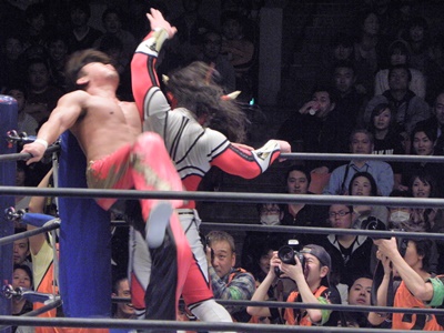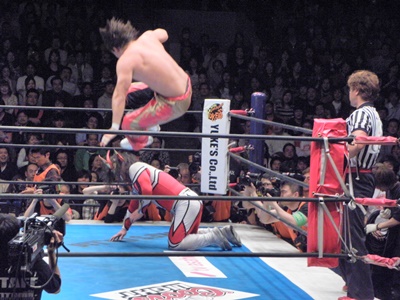 丸藤はライガーが場外で立ち上がるのを待ち、対角線上を走ってトップロープ越えのミサイルキック(左写真)。丸藤リングに戻る。