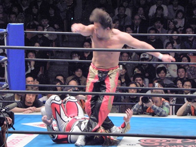 丸藤はライガーの顔をロープから出し、下からドロップキックに行くがライガーは掌底で迎撃(左写真)。10分経過。